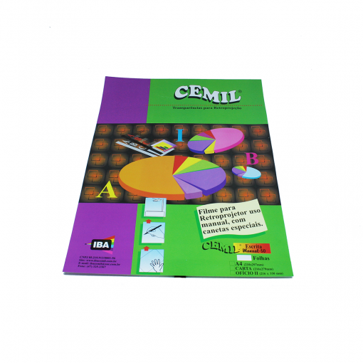 Transparência em filme de Poliester, Clear, Transparente, Cristal, Para ESCRITA MANUAL, USO com CANETAS, produto com a marca CEMIL, no formato OFICIO I (216 X 355 mm), Sem Tarja, caixa com 100 folhas.